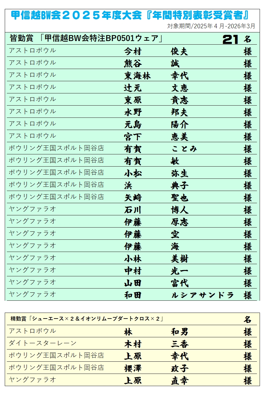 甲信越ブランズウィック会主催大会年間5大会に於いて、「皆勤賞」達成の方に、年間特別表彰の授与